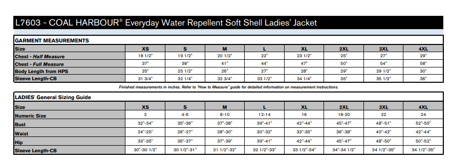 Ladies XS, Ladies SM, Ladies M, Ladies L, Ladies XL, Ladies 2XL, Ladies 3XL, Ladies 4XL